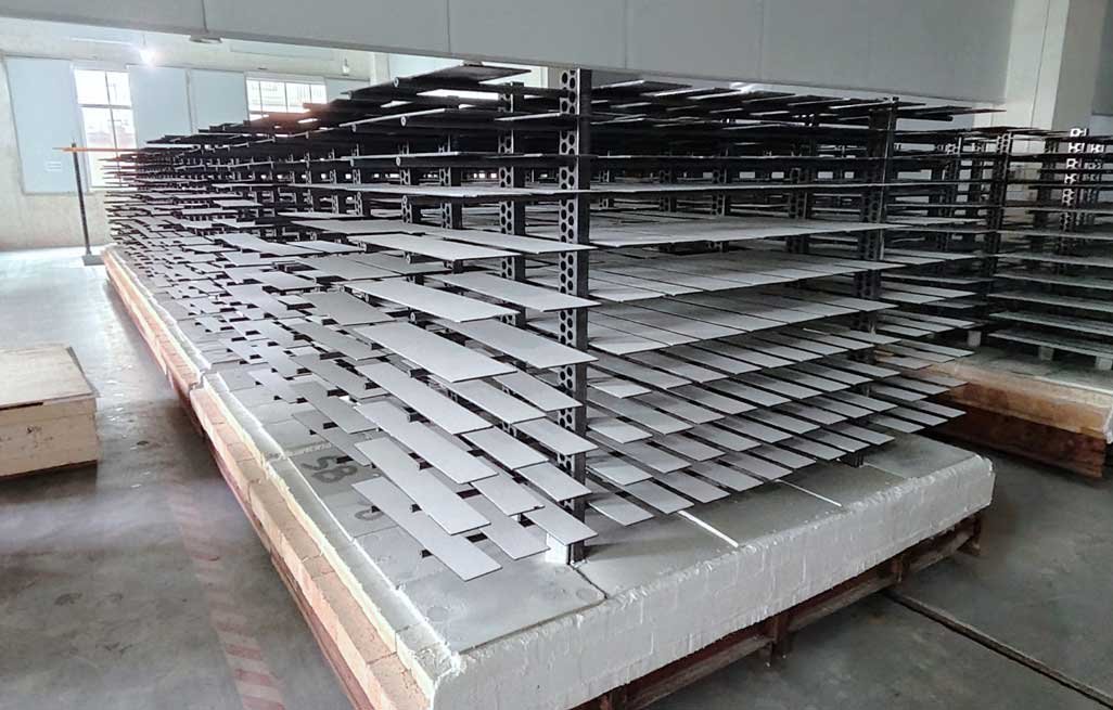 silicon carbide kiln shelves and rollers stored and organized in warehouse during logistics preparation stage